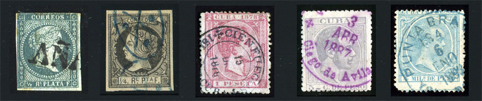 En el caso de Antillas y Cuba aparece una diversidad impresionante de canceladores con colores y formas variados. Es también necesario destacar la gran profusion de matasellos mudos en forma de ovalos, circulos, lineas, rombos, etc.