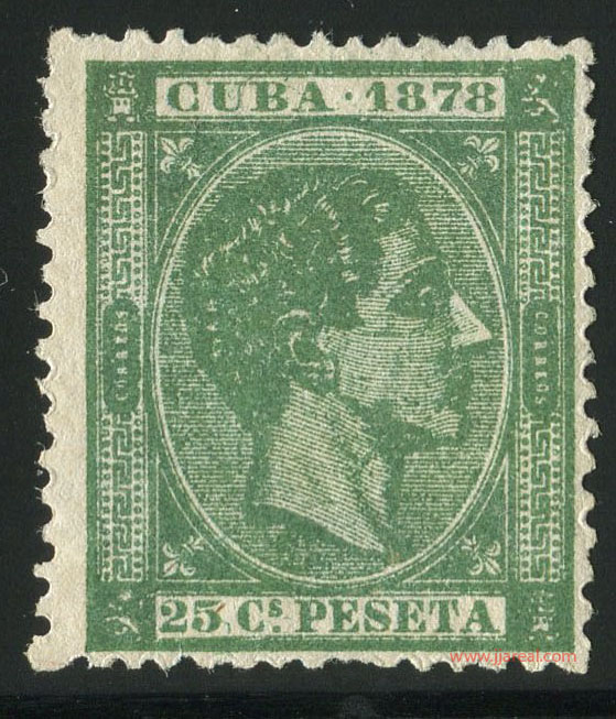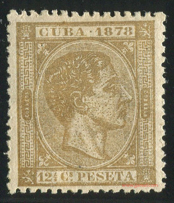 La emisión empleada en Cuba en 1878 presenta el mismo diseño que el utilizado en 1877. Se trata del mismo busto del rey Alfonso XII, mirando a la derecha, sobre un óvalo de rayas horizontales. En su cartucho superior se indica CUBA 1878 en lugar de CUBA 1877 empleado el año anterior.
