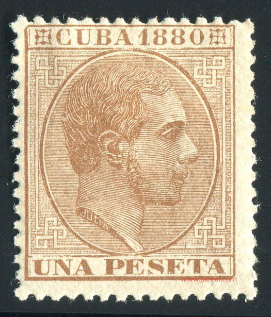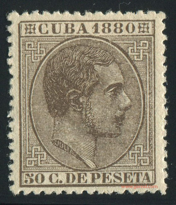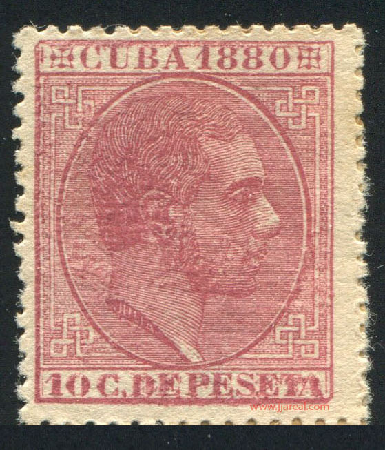 En la emisión de Cuba de 1880 se cambió el diseño con relación a las emisiones anteriores. Presenta en este caso un cuadro de forma rectangular con dos cartuchos en su parte superior e inferior. En la parte central efigie del rey Alfonso XII mirando a la derecha dentro de un óvalo. El cartucho superior presenta el texto CUBA 1880 entre dos adornos. El cartucho inferior indicaba el valor del sello en Céntimos de peseta o bien el valor UNA PESETA.